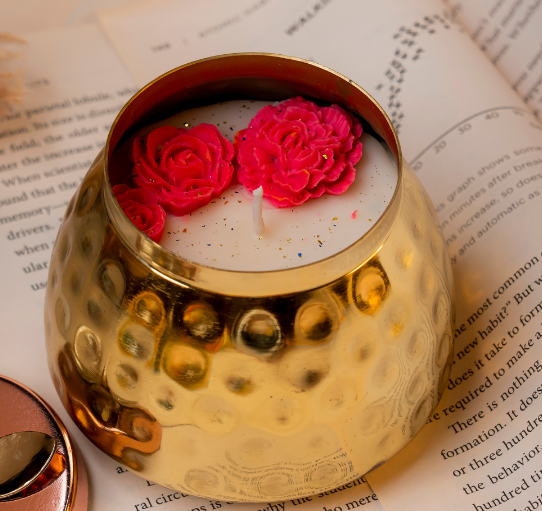 Hand-poured soy wax candle in a hammered brass jar